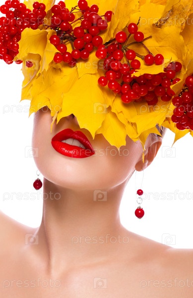 Осенняя красивая женщина. Красивый макияж. Желтые листья, ягоды
