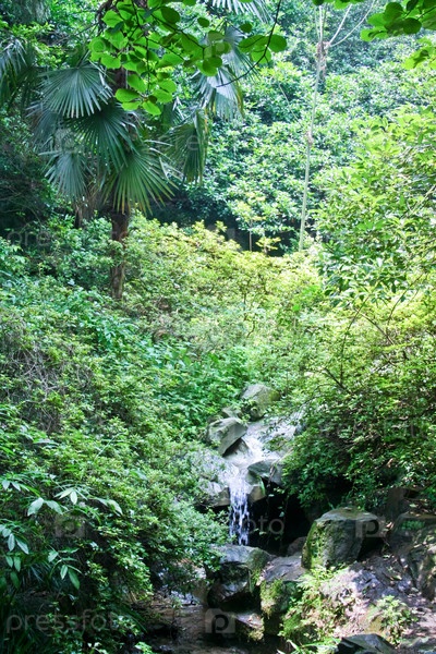 Источник холодной воды среди скал и растений в тени