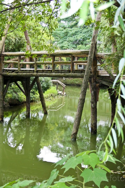 Старый деревянный мост через канал в парке Сучжоу, Китай