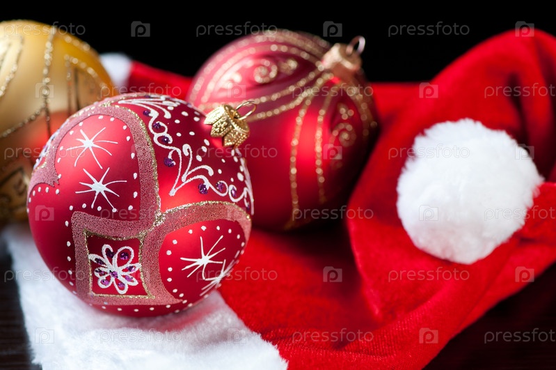 Колпак Санты и новогодние шары, крупный план