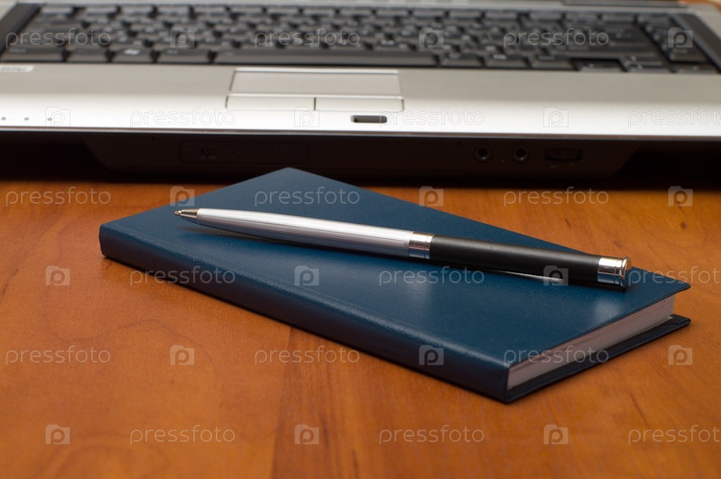 Блокнот с ручкой и ноутбуком на столе
