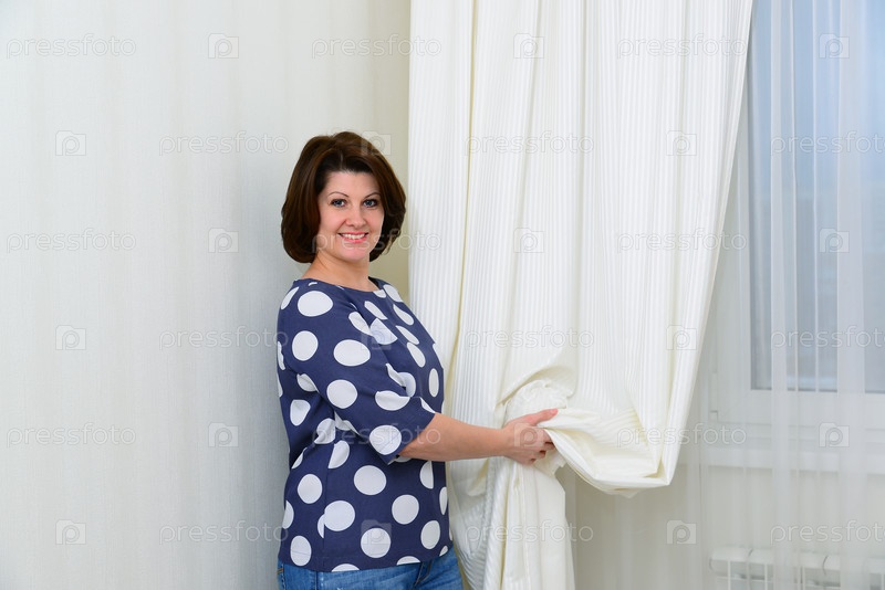 Женщина держит белый занавес