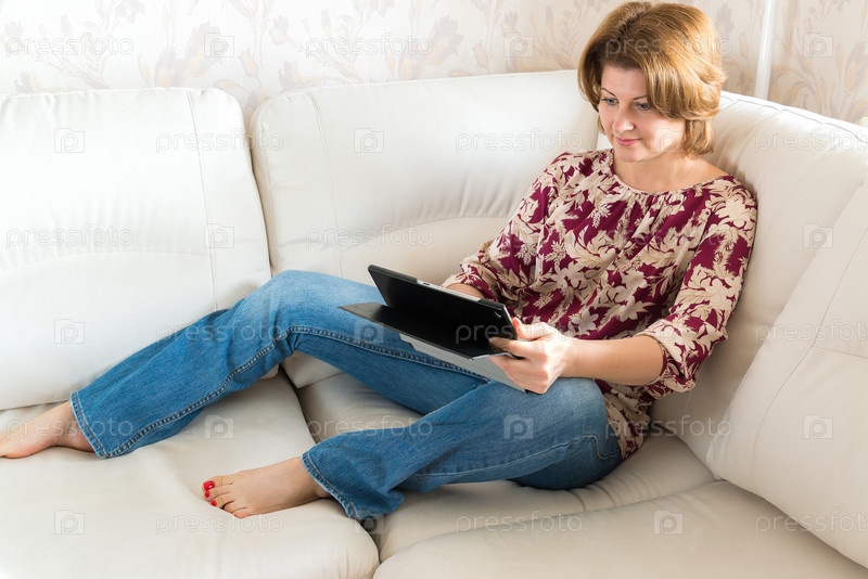 Женщина работает на планшете дома