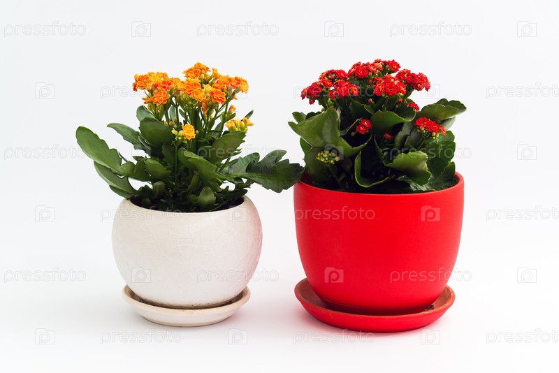 Оранжевый и красный каланхоэ в горшке на светлом фоне