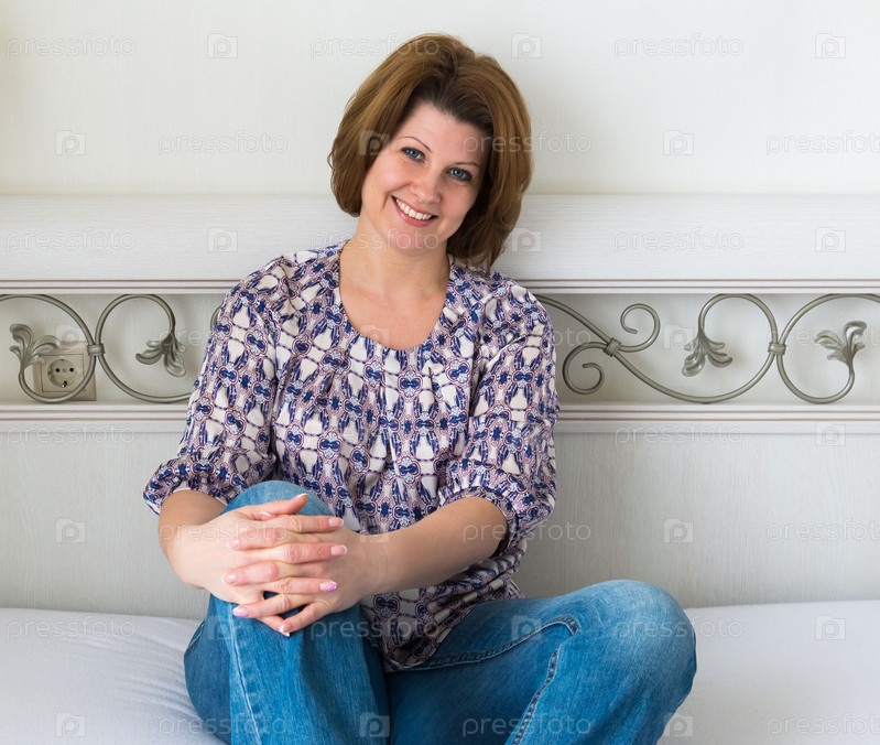 Женщина, сидя в спальне на кровати