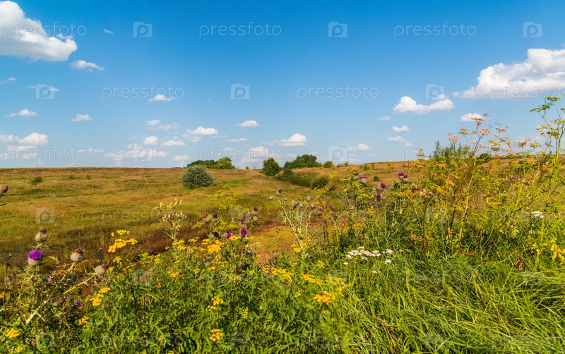 Степной пейзаж с чертополохом на переднем плане