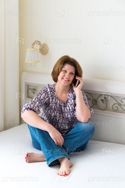 Женщина разговаривает по мобильному телефону, сидя на кровати