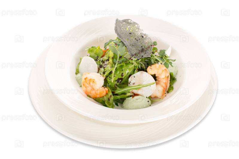 Салат из зелени, морепродуктов и соуса на белой тарелке