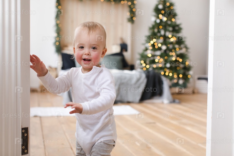 Очаровательный малыш в дверях уютной спальни