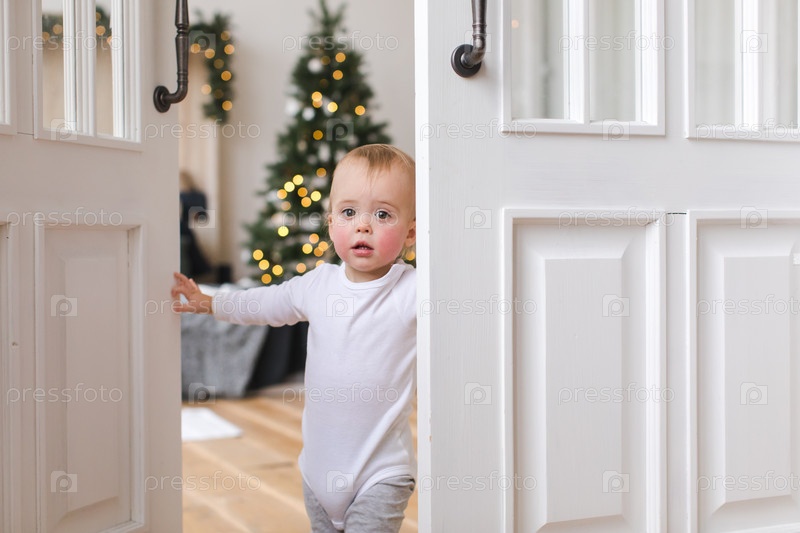 Очаровательный малыш в дверях уютной спальни