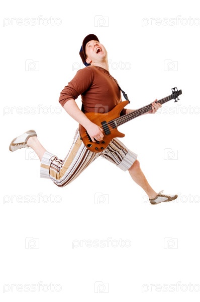 Молодой музыкант с гитарой, изолированный на белом фоне