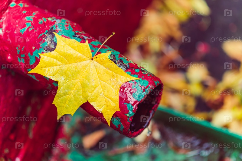 Желтый кленовый лист лежит на красной трубе