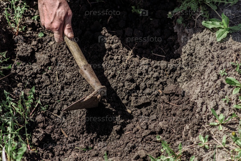 Человек копает землю мотыгой