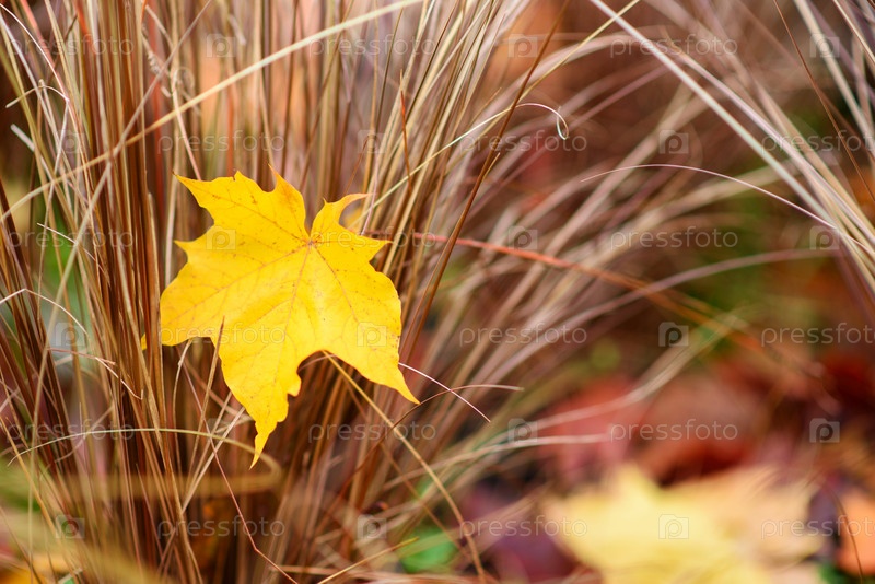 Желтые листья лежат на траве в парке