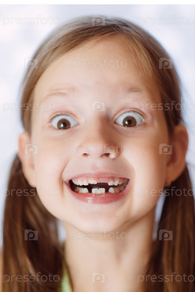 Беззубая девочка смеется с открытым ртом