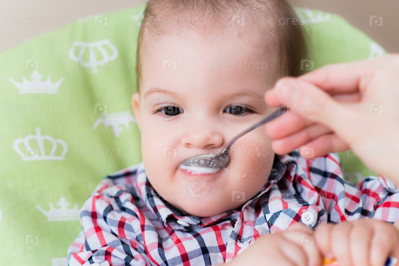 Мать кормит ребенка кашей