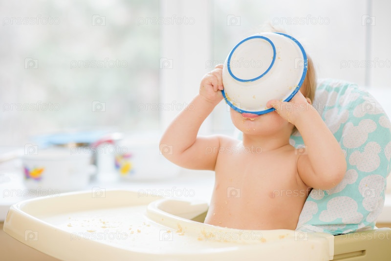 Ребенок на кухне ест кашу