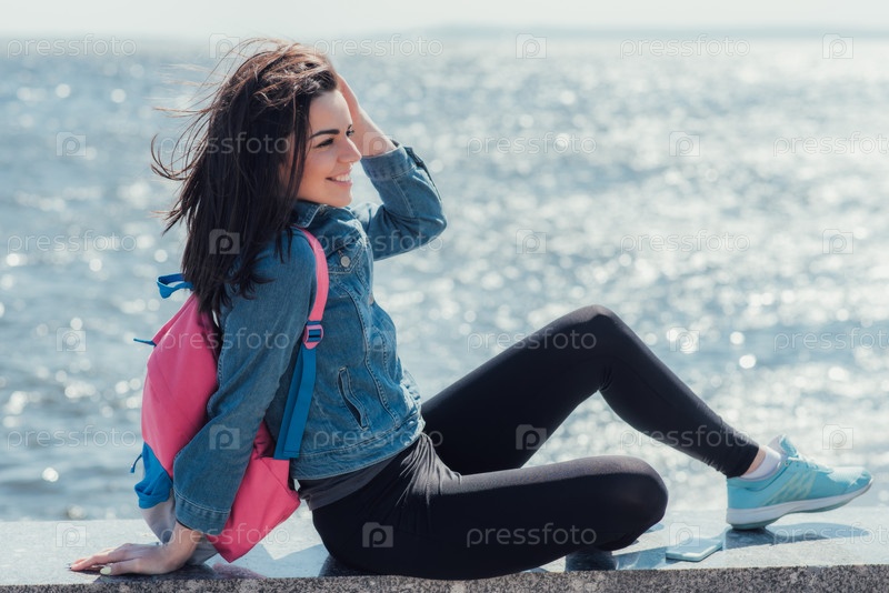 Девушка модель позирует на фоне прекрасного моря