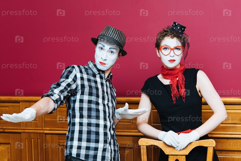 Мимы позируют на красном фоне стены