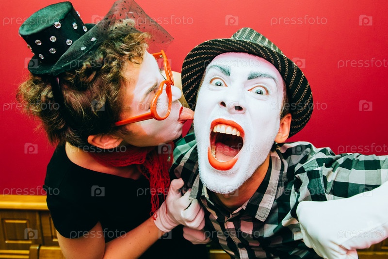 Мимы позируют на красном фоне