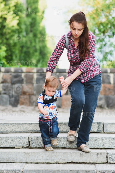Мама страхует ребенка во время прогулки