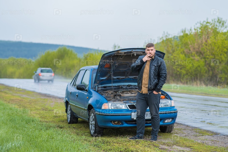 Встревоженный водитель пытается починить машину