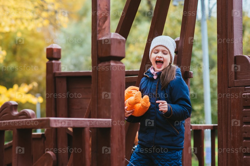 Девочка играет с куклой на улице