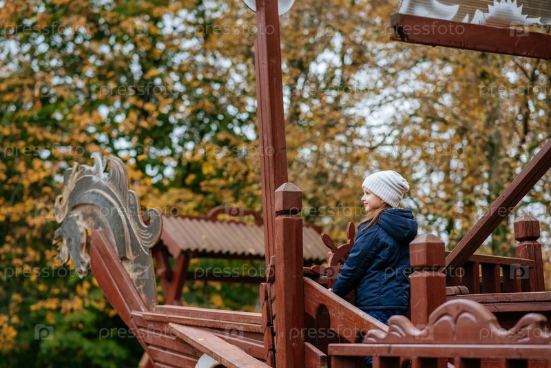 Маленькая девочка, у руля корабля в парке