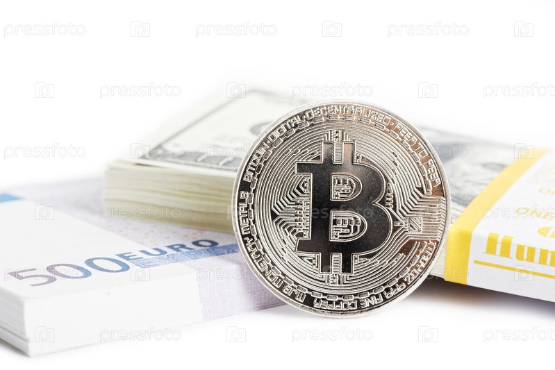 Монета биткоин и пачки евро и доллары