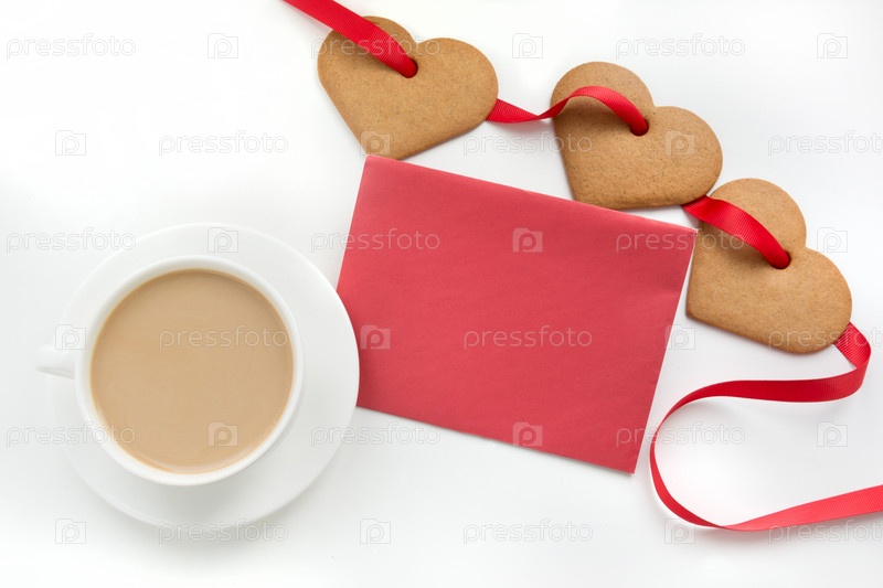 Чашка кофе с молоком и печеньем в форме сердца