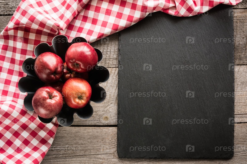 Спелые красные яблоки с клетчатым полотенцем