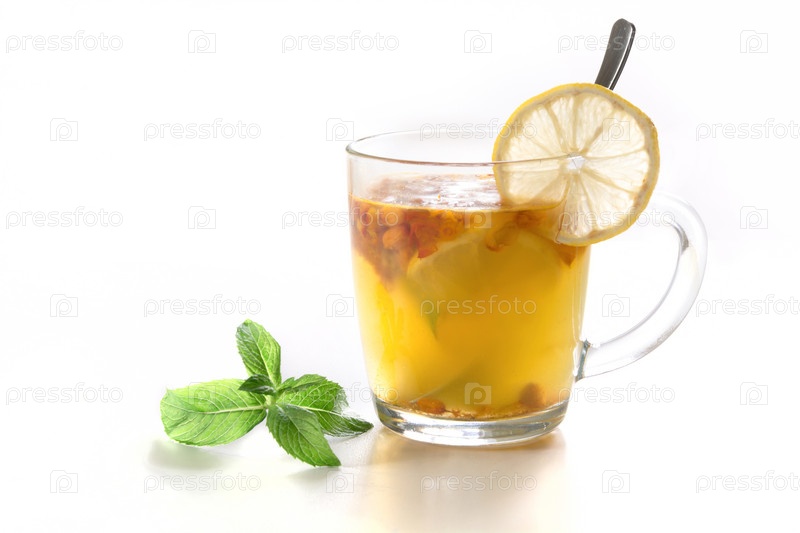 Чашка здорового напитка календулы, лимона и мяты на белом фоне