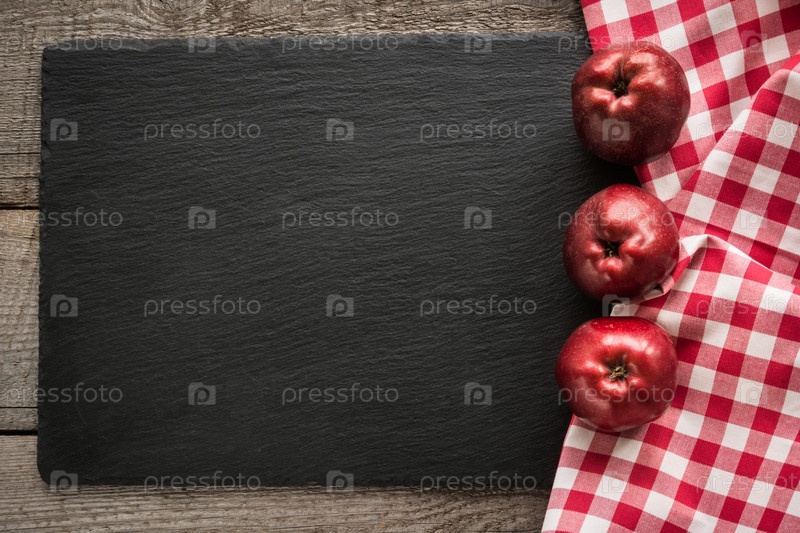 Спелые красные яблоки с клетчатым полотенцем