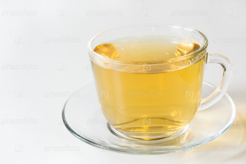 Стеклянная чашка с зеленым чаем на белом фоне