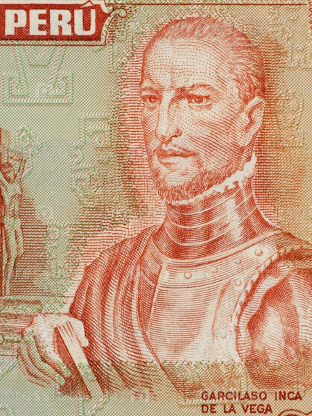 "Эль инк" Гарсиласо де ла Вега на банкноте 1974 г. из Перу. Историк и писатель, признанный за его вклад в историю, культуру и общество инков