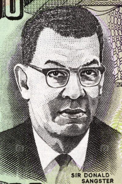 Дональда Сангстера (1911-1967) на купюре 100 долларов из Ямайки. Ямайский политик и второй премьер-министр Ямайки