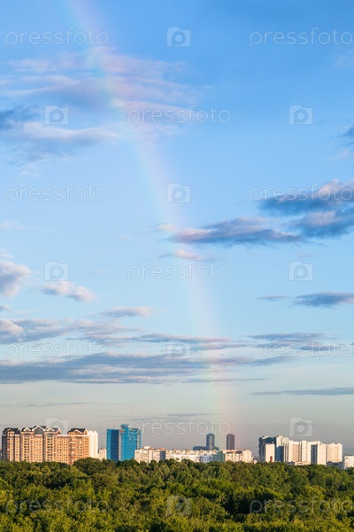 Радуга в синем вечернем небе над жилыми домами