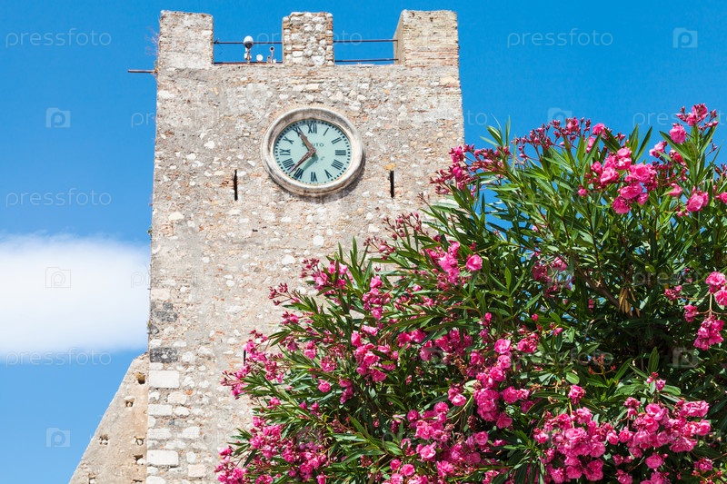 Олеандр дерево и средневековые башни с часами в Таормине