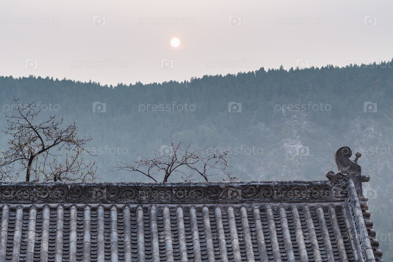 Солнце над крышей храма на Восточном холме в Лунмэнь