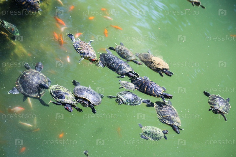Черепахи плавают в зеленой воде в городском пруду
