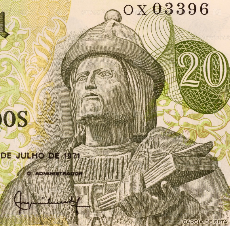 Гарсия де Орта на купюре 20 эскудо 1971года из Португалии. Врач, естествоиспытатель и пионер в области тропической медицины