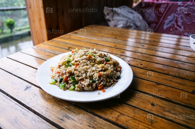 Жареный рис с овощами на тарелке