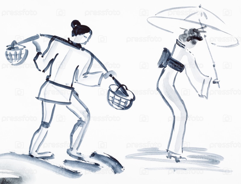 Крестьянин с коромыслом и японская женщина с зонтиком