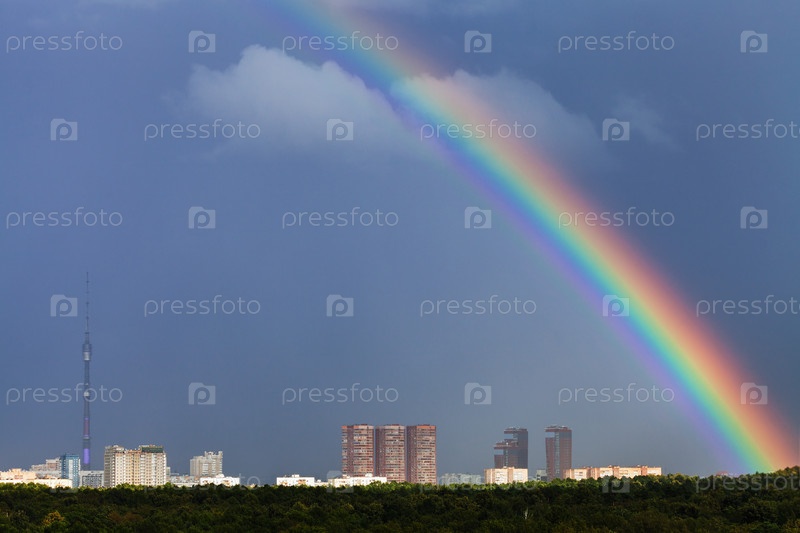 Радуга в темно-синем небе над городом с телебашней