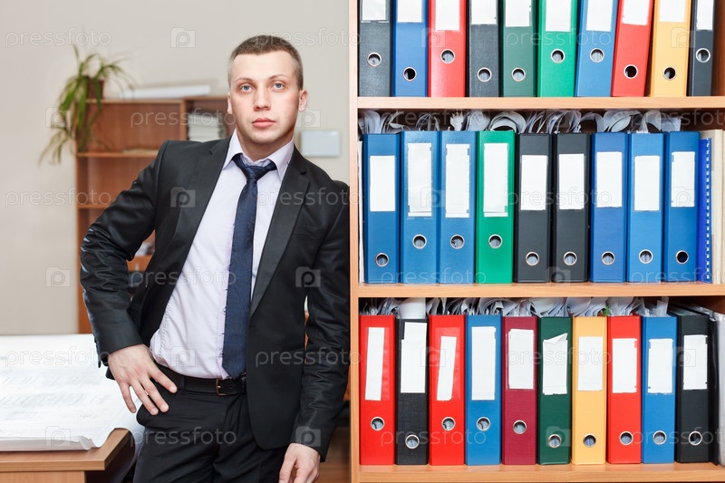 Красивый бизнесмен стоит около книжной полки