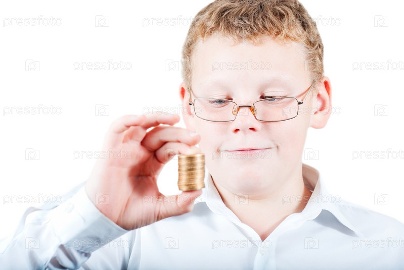 Мальчик держит стопку монет