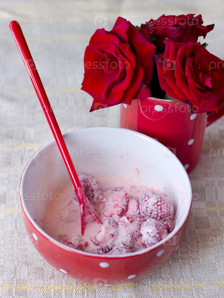 Красная чашка с клубникой и сливками на завтрак