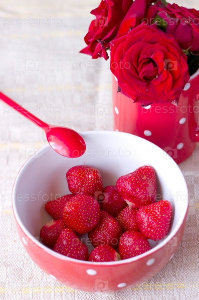 Красная чашка с клубникой на завтрак