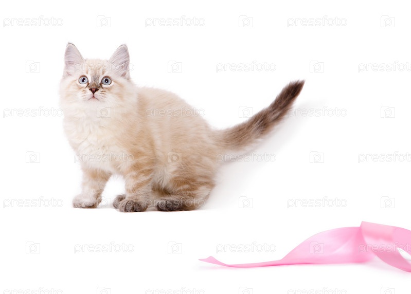 Милый британский котенок играет с розовой лентой