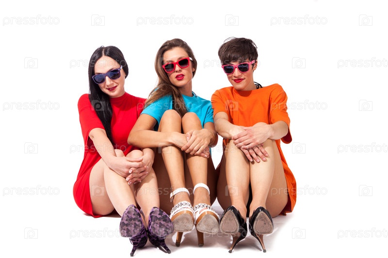 Три красивые девушки сидят на белом фоне